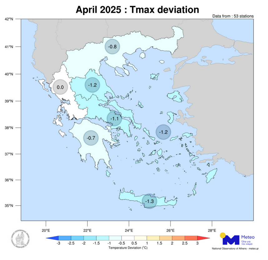 Ο Απρίλιος ήταν ένας ψυχρός μήνας με αρνητικές αποκλίσεις θερμοκρασίας από τις κανονικές τιμές σε όλα τα γεωγραφικά διαμερίσματα της χώρας. Πιο συγκεκριμένα, σύμφωνα με τα στοιχεία του ΕΑΑ, οι αρνητικές αποκλίσεις κυμάνθηκαν από -0.7°C (στη Πελοπόννησο) έως και -1.3°C (στη Κρήτη).