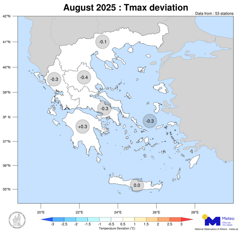Ο Αύγουστος ήταν ένα μήνας με θερμοκρασίες κοντά στις κανονικές τιμές. Πιο συγκεκριμένα, σύμφωνα με τα στοιχεία του ΕΑΑ, οι αποκλίσεις στη χώρα κυμάνθηκαν από -0.4°C (στη Θεσσαλία) έως και +0.3°C (στη Πελοπόννησο).