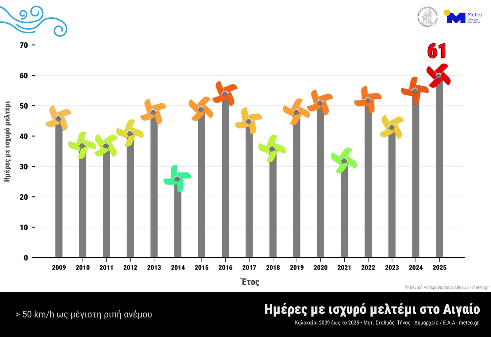 Στο σύνολο των 62 ημερών της χρονικής περιόδου 1ης Ιουλίου έως 31 Αυγούστου, τα 17 τελευταία έτη ο αριθμός των ημερών με ισχυρούς βόρειους ανέμους κυμαίνεται από 20 ημέρες (το 2014), έως 47 ημέρες (το 2016).