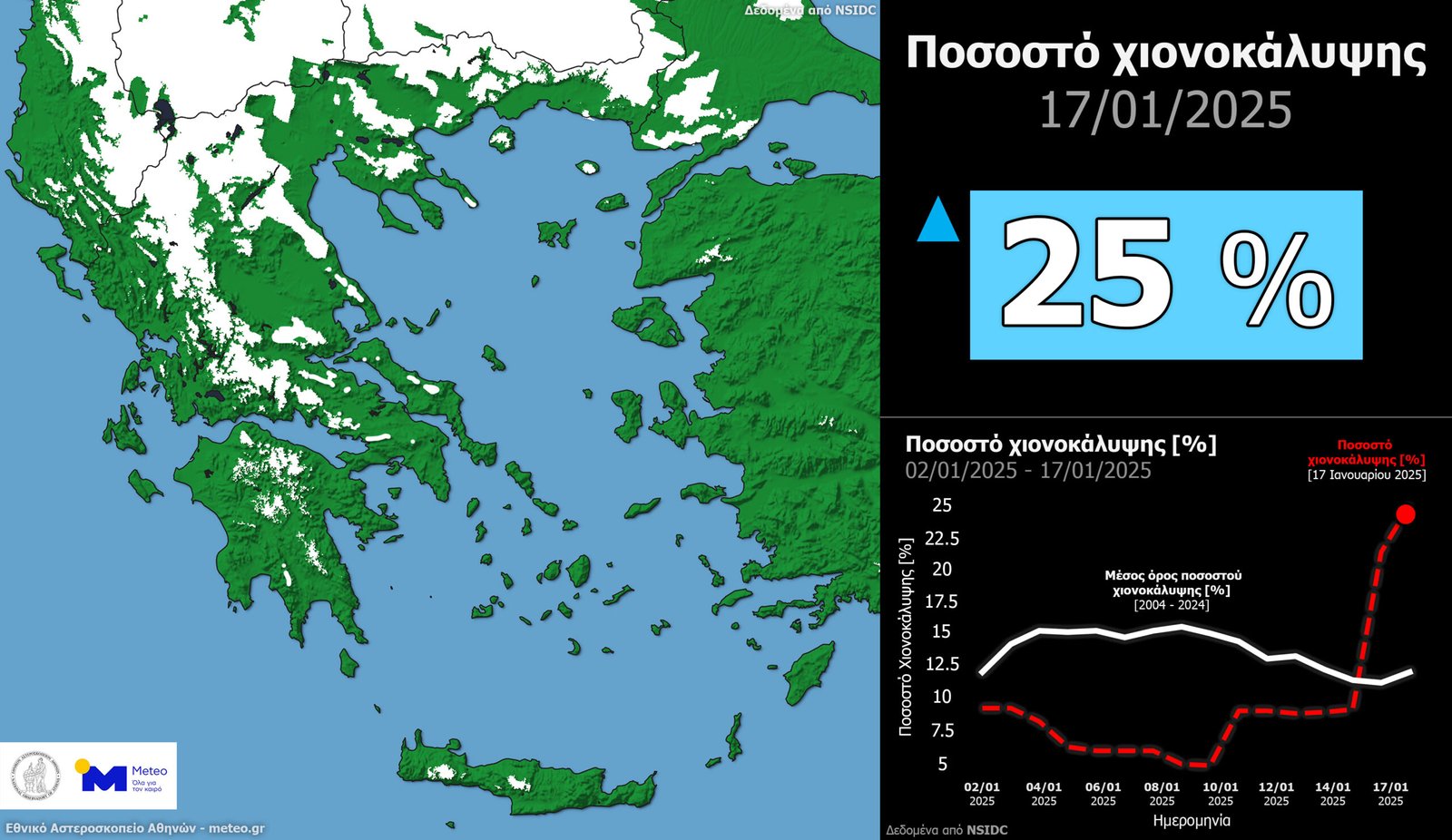 Στις 17/01, τα στοιχεία έδειχναν πως η χιονοκάλυψη στη χώρα παρουσίαζε σημαντική θετική απόκλιση (25%) από τον μέσο όρο, κάτι που είχε προκύψει μετά από την κακοκαιρία που είχε προηγηθεί.