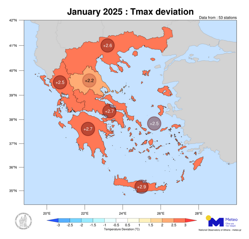 Οι θερμοκρασιακές αποκλίσεις κυμάνθηκαν από +1.2°C (στη Κρήτη) έως και +2.9°C (στη Δυτική Ελλάδα).