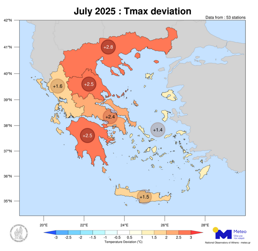Ο Ιούλιος ήταν ένας πολύ θερμός μήνας με πολύ σημαντικές θετικές αποκλίσεις θερμοκρασίας από τις κανονικές τιμές σε όλα τα γεωγραφικά διαμερίσματα της χώρας. Πιο συγκεκριμένα, σύμφωνα με τα στοιχεία του ΕΑΑ, οι αποκλίσεις στη χώρα κυμάνθηκαν από +1.4°C (στα νησιά του Αιγαίου) έως και +2.8°C (στη Μακεδονία και τη Θράκη).