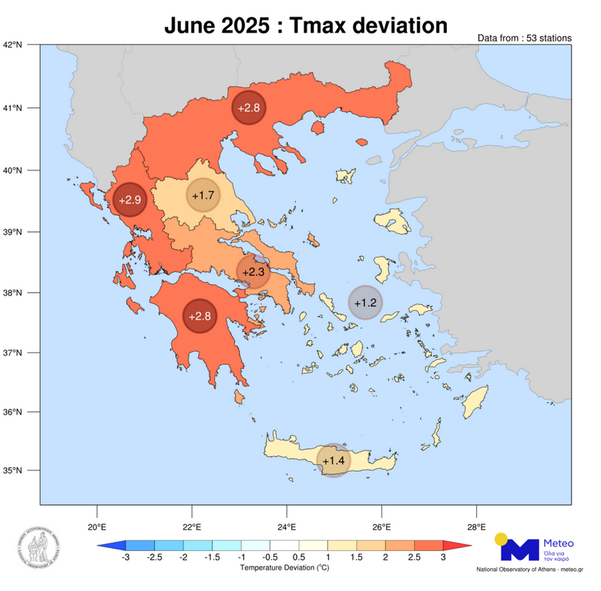Ο Ιούνιος ήταν ένας πολύ θερμός μήνας με σημαντικές θετικές αποκλίσεις θερμοκρασίας από τις κανονικές τιμές σε όλα τα γεωγραφικά διαμερίσματα της χώρας. Πιο αναλυτικά, με βάση τα στοιχεία του ΕΑΑ, ο Ιούνιος του 2025 ήταν ο 2ος θερμότερος Ιούνιος από το 2010, ενώ κάτι ακόμα που ξεχωρίσαμε από τον συγκεκριμένο μήνα ήταν η μεγάλη συχνότητα εμφάνισης μελτεμιού στο Αιγαίο, με τις 24 από τις 30 μέρες του μήνα να έχουμε φουσκωμένη θάλασσα. Αυτό ήταν κάτι που δεν είχαμε ξαναδεί τα τελευταία 17 χρόνια!