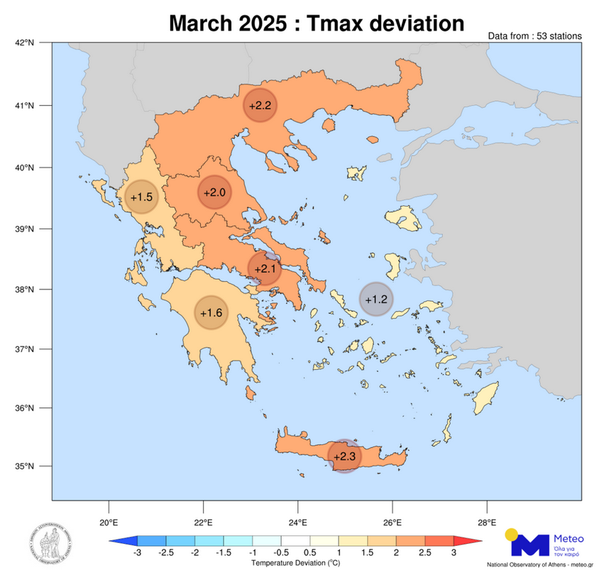 Ο Μάρτιος ήταν ένας θερμός μήνας με θερμοκρασίες υψηλότερες από τις κανονικές τιμές σε όλα τα γεωγραφικά διαμερίσματα της χώρας. Πιο συγκεκριμένα, σύμφωνα με τα στοιχεία του ΕΑΑ, οι θετικές αποκλίσεις κυμάνθηκαν από +1.2°C (στα νησιά του Αιγαίου) έως και +2.3°C (στη Κρήτη).