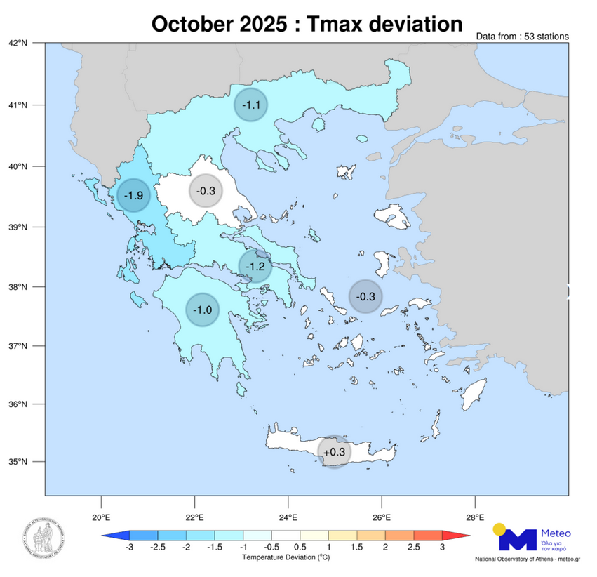 Ο Οκτώβριος ήταν ένας ψυχρός μήνας με αρνητικές αποκλίσεις θερμοκρασίας από τις κανονικές τιμές σχεδόν σε όλα τα γεωγραφικά διαμερίσματα της χώρας. Πιο συγκεκριμένα, σύμφωνα με τα στοιχεία του ΕΑΑ, οι αποκλίσεις στη χώρα κυμάνθηκαν από -1.9°C (στη δυτική Ελλάδα) έως και +0.3°C (στη Κρήτη).