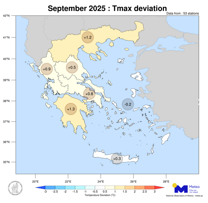 Ο Σεπτέμβριος ήταν ένας μήνας με θερμοκρασίες ελαφρώς υψηλότερες από τις κανονικές τιμές σε όλα σχεδόν τα γεωγραφικά διαμερίσματα της χώρας. Πιο συγκεκριμένα, σύμφωνα με τα στοιχεία του ΕΑΑ, οι αποκλίσεις στη χώρα κυμάνθηκαν από -0.2°C (στα νησιά του Αιγαίου) έως και +1.3°C (στη Πελοπόννησο).