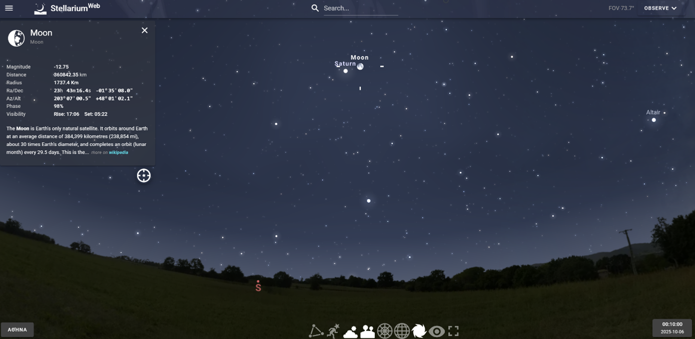 Κρόνος και Σελήνη στον νυχτερινό ουρανό, νότια. Αθήνα, 00:10 τοπική ώρα.