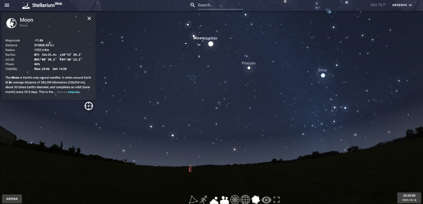 Δίας και Σελήνη στον νυχτερινό ουρανό, ανατολικά. Αθήνα, 03:20 τοπική ώρα.