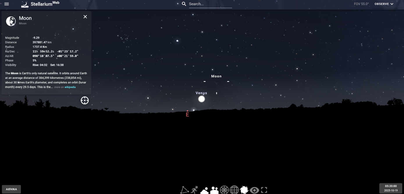 Αφροδίτη και Σελήνη στον νυχτερινό ουρανό, ανατολικά. Αθήνα, 05:20 τοπική ώρα