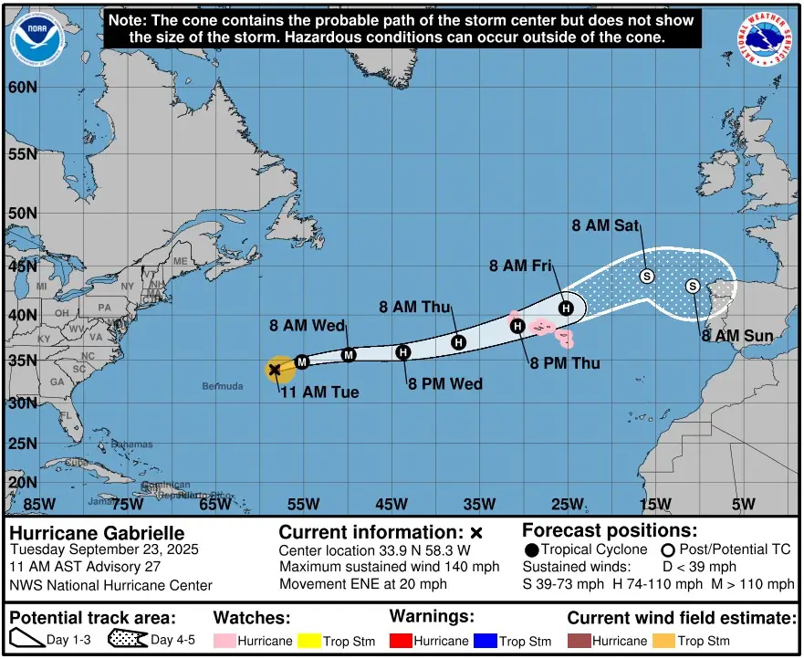 Παρά την αναμενόμενη εξασθένηση, ο Gabrielle προβλέπεται να συνεχίσει να προκαλεί επικίνδυνες συνθήκες σε μεγάλο τμήμα του Βόρειου Ατλαντικού, τόσο στη θάλασσα όσο και στις παράκτιες περιοχές.